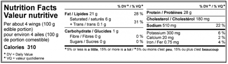 Chicken, Water, Salt, Spices, Onion Powder, Chicken Broth, Garlic Powder, Flavour, Canola Oil.