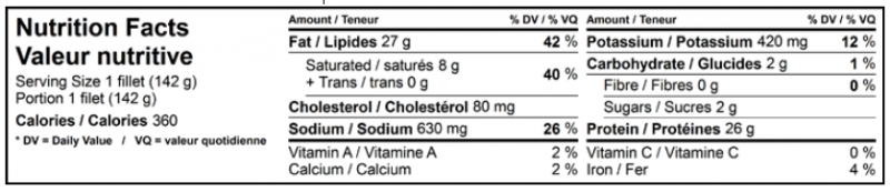 Salmon, Bacon (pork, water, salt, sugar, sodium erythorbate, sodium phosphate, spices, sodium nitrite, smoke), Sugars (maple sugar, brown sugar), salt, dehydrated red bell pepper, smoke flavour, spice, caramel, flavour.